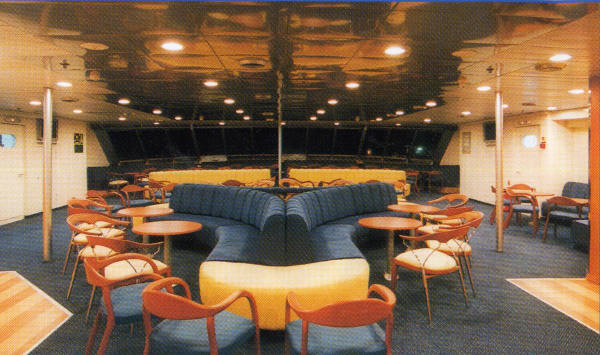 | Below: The forward part of the Distinguished class lounge prior to the ship's lengthening, showing the good panoramic views afforded by this space's prime location on the middle of the three passenger decks. Immediately aft is a bar to port and further bay-seating. The deck above features passenger cabins forward and a space referred to as a conference room, but actually more of an additional passenger lounge (although seemingly usually closed to passengers). |