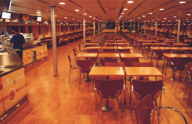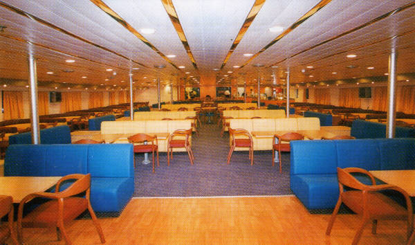 | Above & below: Looking forward in the main Economic Class lounge, situated on the lower passenger deck, forward of the reception lobby. The space is seen (above) prior to the ship's lengthening and (below) afterwards, in 2005. The latter picture shows how this is now a very large area with the additional space created used simply for more tables and chairs with booth sofa seating around the perimiter. |