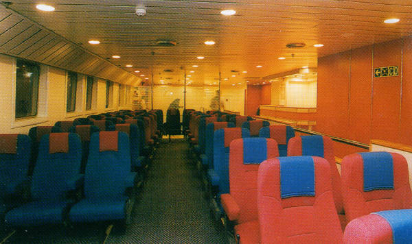 | Below: A picture looking aft towards the Reception Lobby on the lower passenger deck - beyond the reclining seating is an escalator used to transport passengers up from the car deck. The desk visible in the background is the reception and, just beyond, is a small shop. |