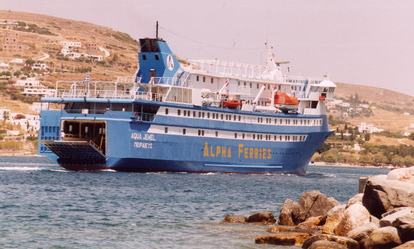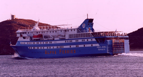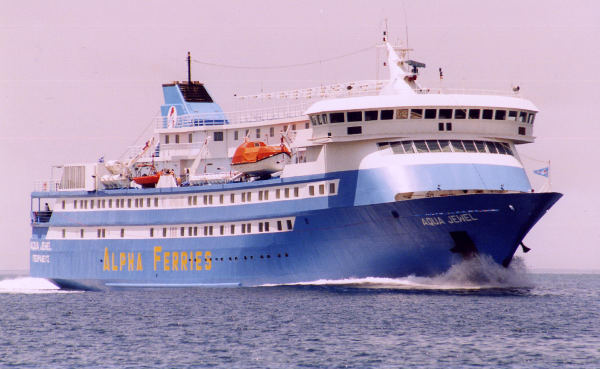 | The Aqua Jewel was ordered for inter-island service in the Greek islands but, after being launched in 1998, was put to one side with the ship lying at Drapetsona for several years. The ship was eventually completed to the account of a new operator, Alpha Ferries, who put her into service in the competetive Rafina-based schedules operating out to Mykonos (although in the Aqua Jewel's case, the route was usefully extended to Paros). The ship was thus competing directly with the more established Hellas Ferries and Blue Star, and reports of her success vary between her being very busy to virtually empty. Additionally, the Aqua Jewel sufferred somewhat from a reputation as a 'roller' and was reportedly dry-docked for fairly extensive hull modifications after her first season. This was clearly not enough and more measures were taken in the Winter of 2004/05 when the ship was lengthened, increasing capacity but also seemingly stability. |