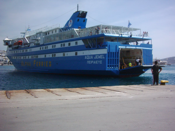 | Above: At Mykonos in May 2004 - unlike her Rafina-based competitors, this is not the end of the line for the Aqua Jewel, which operates an extra leg, across to Paros. (Picture courtesy David Baker) |