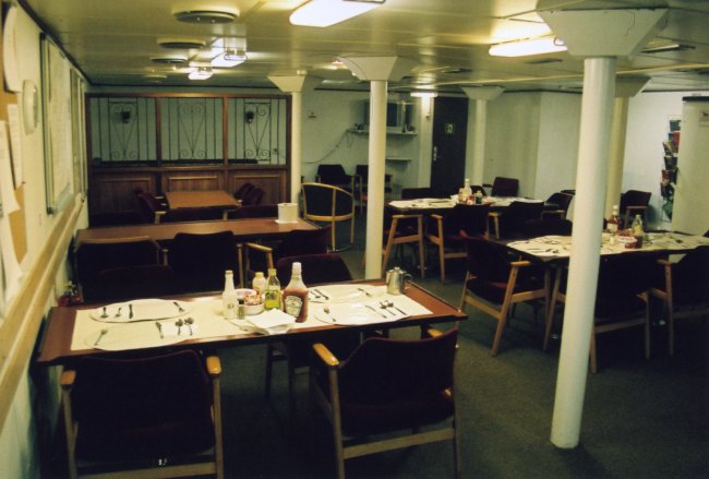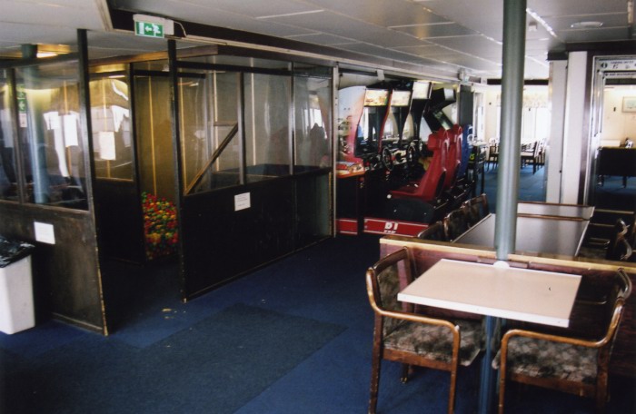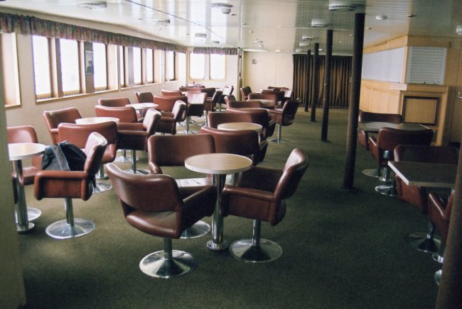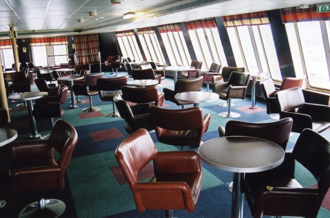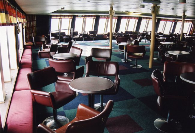 Above: Right aft on D Deck is the aft bar, originally an open deck shelter before being enclosed early in the ship's career. Pictures of Tallinn still hang here although the windows on either beam have now been covered over. |