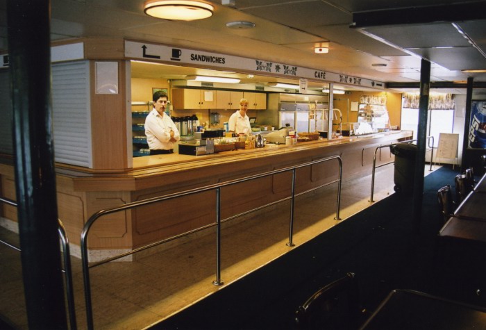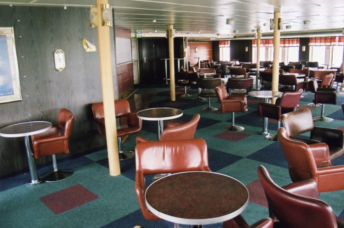 Moving aft from the forward restaurant, the open-plan central section on D Deck retains its cafeteria servery from where very reasonably-priced hot meals were available. At the aft end, a bank of reclining seats to starboard are adjacent to the current childrens’ play area with wooden slide and sea of balls; although not original (there was a small kiosk here when the ship was built) this area does seem to have been added fairly early on in the ship’s career. Right aft, a further bar area can be found in a space which was originally a covered deck shelter before being enclosed early on by Viking Line. Pictures of Tallinn could be found adorning the walls of this space, but the original windows to either side had been mysteriously filled in: a similar thing had happened to the aft lounge on the Queen of Prince Rupert later in the trip and this was explained as being due to the Canadian authorities insisting on the replacement of the window panes at a cost of several thousand dollars each – it was more cost effective to lose the windows altogether. Back on the Apollo, upstairs the main bar forward remained a timewarp with comfortable if somewhat battered leather-covered chairs and perimeter sofa bays. A pair of conference rooms were out of use just aft (these were originally further reclining seat lounges); in one of them could be found a rather interesting relic in the form of what appeared to be one of the distinctive restaurant chairs from one of the 1960s Swedish Lloyd trio Saga, Svea and Patricia. The only explanation we could come up for this one was that it somehow got moved over when the Apollo, as Olau Kent, operated alongside the Saga (as Olau Finn) in the early years of the Sheerness-Vlissingen route between 1976 and 1980. In terms of unlikely finds however it ranks with the chair from the Second Class lounge of Sealink’s St George which sits today in the purser’s office on board Ventouris Ferries’ Siren. [continued below] |