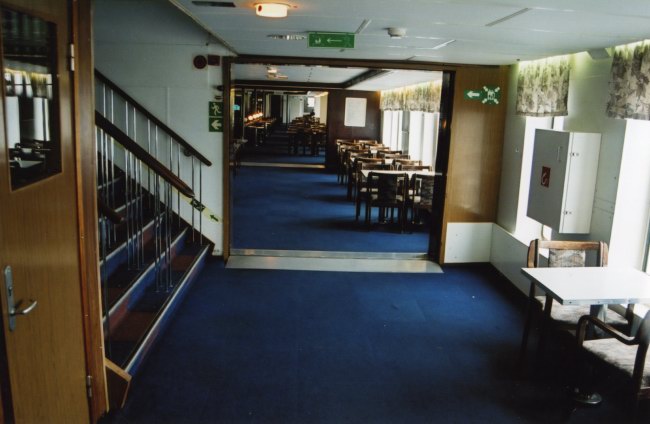 Above: Just aft of the restaurant, looking back down the port-side of the ship into the cafeteria area. The stairs to the left lead up to the bar on E Deck. |