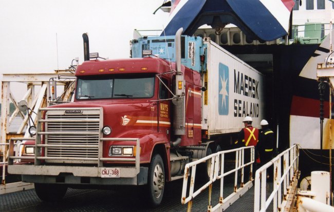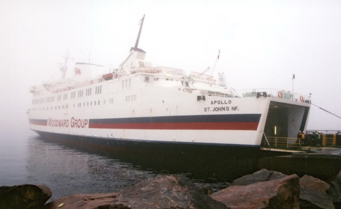 Above: Another load of freight squeezes out of the Apollo's little car deck in St Barbe. |