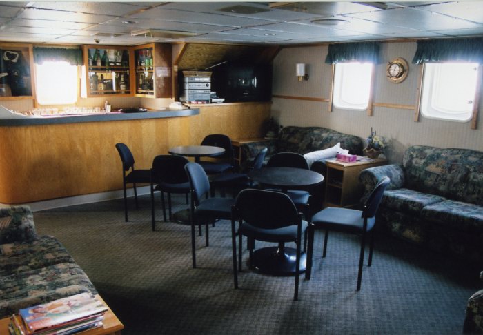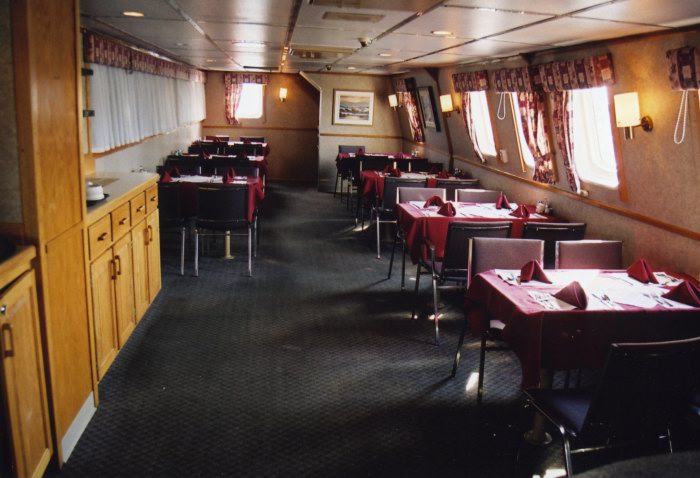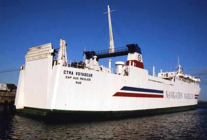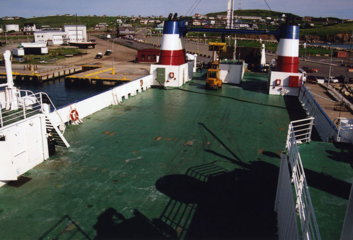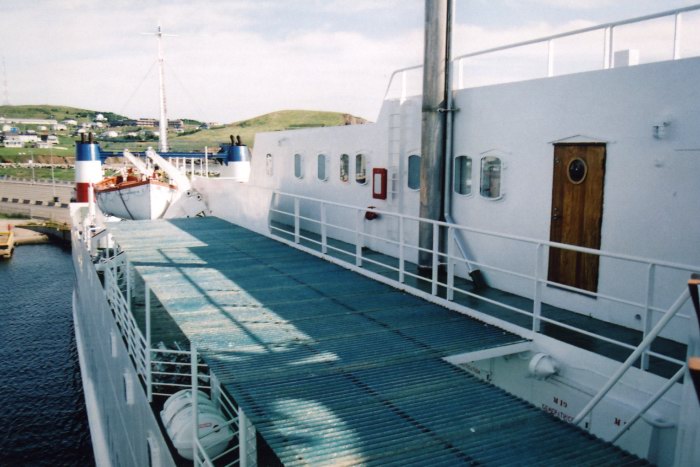 Today the C.T.M.A. Voyageur is used mainly in the Winter when the ‘Vacancier’ is laid up. She runs a similar route, catering for freight only, but no longer follows the St Lawrence all the way to Montreal, services terminating at Matane on the Gaspé peninsular instead. We were welcomed on board the ship as she lay by in Cap-aux-Meules by the ship’s master. Although showing some signs of wear and tear she is in generally good condition considering her role and age. Sadly there is apparently now a rather large question mark about her future as her operations are tightly regulated by the Canadian authorities who clearly view this old ship with a degree of suspicion; it is presumably not worthwhile for her owners to invest in life-extending work on her, and there are no signs of any of the safety modifications many of her contemporaries have received: she remains proudly devoid of sponsons, duck tails or subdividing doors on her vehicle deck. The ship no longer carries passengers in regular service, although when the Madeleine had returned late from refit a few weeks before our visit, she had filled in with her nominal capacity for twelve drivers, the ‘Vacancier’ also making a few trips to Souris to help out. |