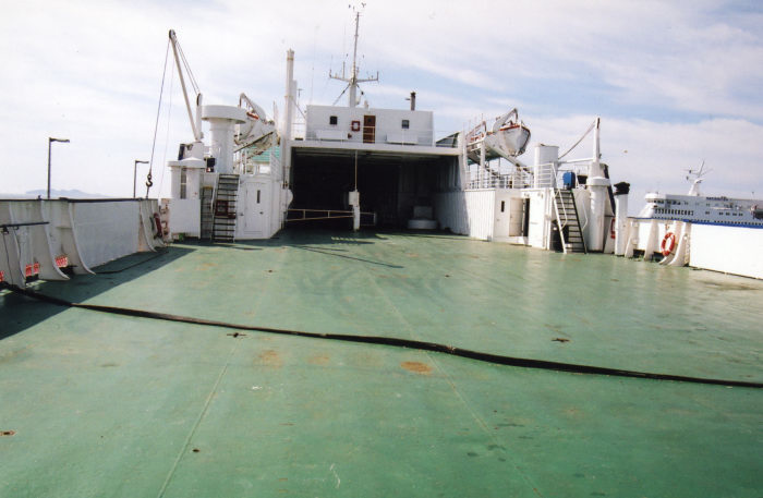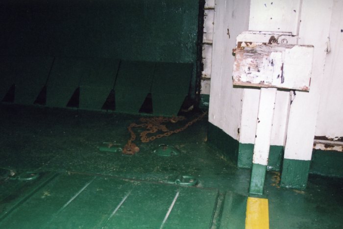 Onboard, she retains a simple layout with an upper vehicle deck, partially enclosed by the superstructure which wraps around the forward end and consists largely of crew and passenger cabins. At the forward end of the lower level can be found a compact eating area with windows overlooking the bow and, adjacent to starboard, a small lounge with bar, five comfy sofas and a couple of tables with chairs. Down below, the main vehicle/train deck is unchanged, seeming incredibly tiny to modern observers. The rail lines are still clearly visible where a simple arrangement of two tracks runs all the way through from the stern to just before the bow door where these were once met by a pair of retractable buffer stops (one either side); the remains of these can be found, the hinge still in place, but the wooden buffer itself cut back to its furthest extent.