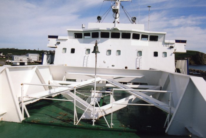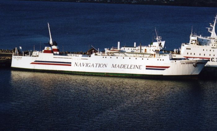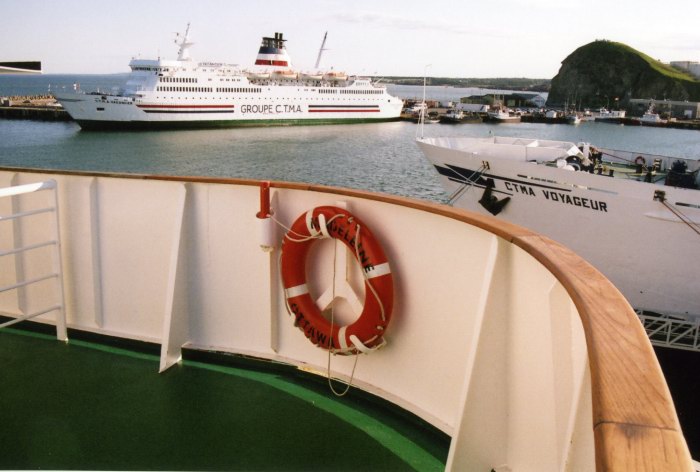 The following morning we were up early and as we headed down to the port we saw the Madeleine departing for Souris in bright sunshine. Our immediate target however was the little freighter C.T.M.A. Voyageur. Completed at the Trosvik Verksted yard in Brevik, Norway in 1972, the ship was the fourth of a quartet of ships ordered by Stena Line in the late 1960s and a number of further non-Stena sisters/half sisters were produced at a variety of Norwegian yards. Before being completed however, Stena sold the ship to British Rail/Sealink for whom she entered service as Anderida (so called after the Saxon name for what would later become Pevensey Castle in Sussex). Completed with railway lines on her main vehicle deck she was deployed on the English Channel routes from Dover, principally the train ferry run to Dunkerque. She latterly also saw service on all Sealink’s Irish Sea routes. Sealink had no further use for the ship, (or sisters Dalriada and Ulidia) by the early 1980s and she was disposed of to Greek owners becoming the Truck Trader in 1981 before heading to New Zealand as the Sealink in 1984, being registered in that country in 1985. A return to Greece followed the subsequent year (under the name Mirela) before the ship finally settled down with her sale to C.T.M.A. in 1987.