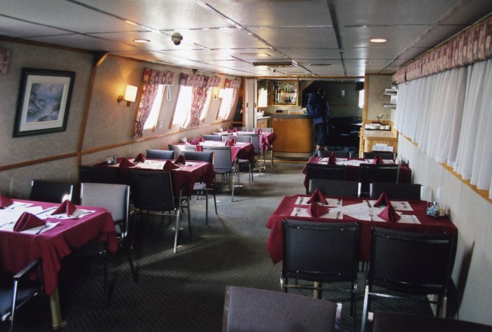 As we pulled into Cap-aux-Meules the other pair of ships in the current C.T.M.A. ferry fleet were lying at their berths: the C.T.M.A. Voyageur and C.T.M.A. Vacancier. For now however, we were happy to make for our hotel and then to dinner where the delights of seal were on the menu. This was all superb and set us up for a late night stroll down to the quayside to observe the ships in the darkness – in fact we were able to walk on board the C.T.M.A. Vacancier for an impromptu look around, but we shall return to her later… |