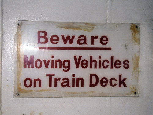Above & below: More reminders of the ship's career as a train ferry: Above One of the cut-back retractable buffer stops at the forward end of the train/freight deck. Below A warning notice in one of the stairwells. |