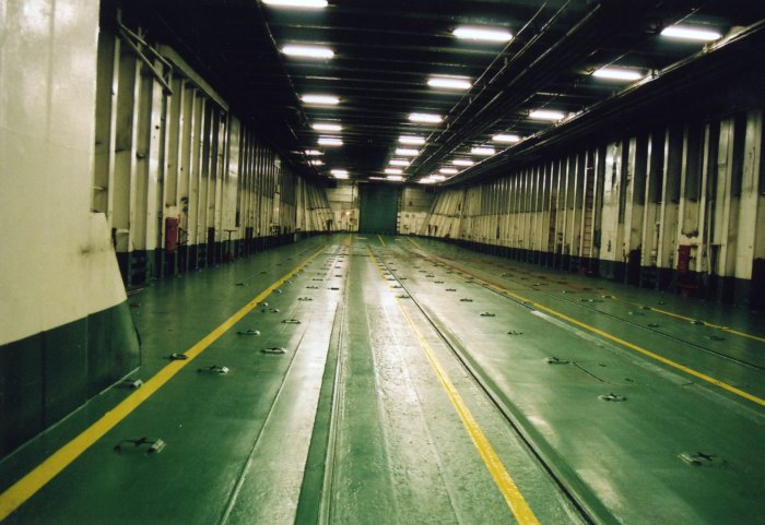 Above: Looking forward on the main freight deck with the parallel railway lines still very evident. |