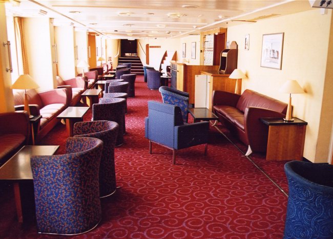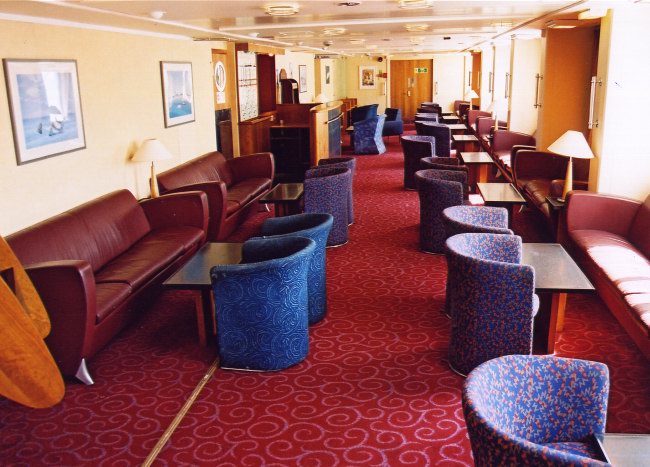 | Above and below: The Club Lounge (aft of Routemaster's) was structurally unchanged from the final P&O days, but there were strange goings-on with the furniture. Although the sofa seating on either side has been retained, GA have removed all the previous leather free-standing single armchairs (destination unknown), replacing them with a variety of chairs still bearing typical Stena-style motifs which had presumably been in crew use or storage since 1998. A sole GA-style square armchair completes the mix. |