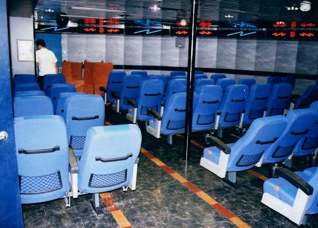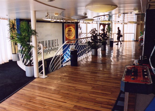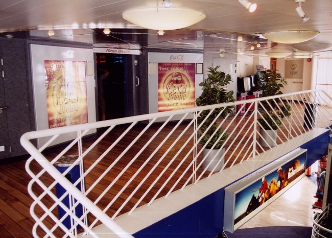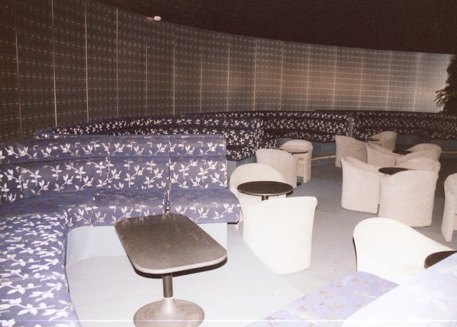 | Above: Once the Rock Box disco, later Stena's Video Warp games area and finally the Coca-Cola Mega Drome, GA, with no other decorative alterations, converted the windowless space just forward of the upper lobby into a reclining seat lounge. The neon lighting around the upper perimeter actually dates from the final Rock Box days, after Stena had had an influence over the original Fantasia design, but before they abandoned the idea of a Cross-Channel discotheque. |