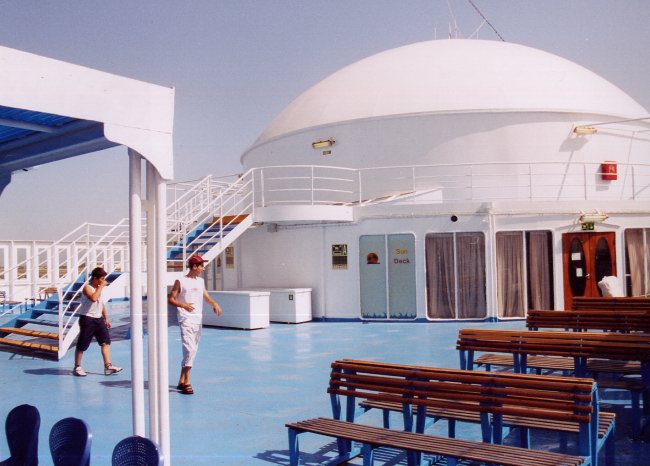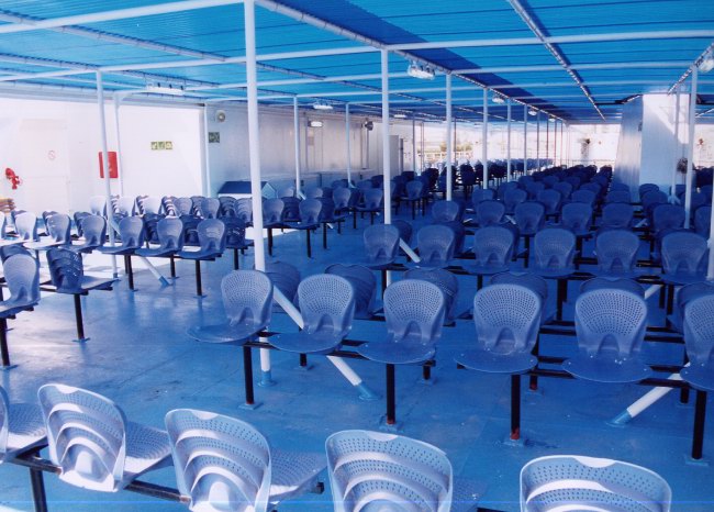 | Above: Beneath the awnings, GA Ferries installed some of their particularly comfortable plastic seating. As evidenced by the volume of passengers clamouring to sit in them, these were a particularly popular touch. Fortunately, the Alkmini A never appeared to run full enough to require many people to sit here (the air conditioned interior being inevitably more popular), unlike former fleetmate Anthi Marina (ex-P O Kent) on Greek domestic service where similar seating is all-too often fully utilised. |