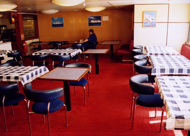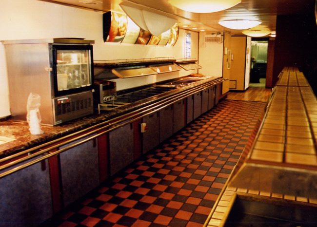 | Above and below: Two views of the Routemaster ro-ro driver's restaurant and its food servery on the starboard side of the upper passenger deck (Deck 7), just aft of the Horizon Lounge. |