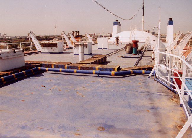 | Above: A final, unusual view of the uppermost deck, astern of the bridge with the dome visible in the background. GA Ferries appeared to have already made an attempt to bring their new ship up to their fleet standard for rust coverage. |