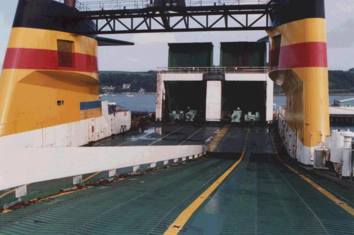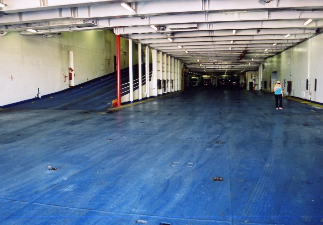 Above & below: The partially-enclosed upper freight deck seen (above) during the construction of the Zenobia and (below) on board the Trapezitza (later Fiesta/Seafrance Cézanne). (Picture below courtesy Roy Thornton Collection) |