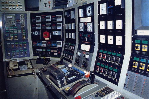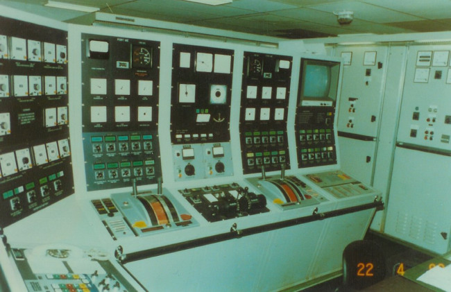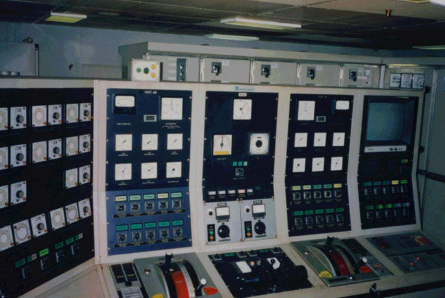 Above, below & bottom: The engine control room on the Zenobia (above). The equivalent space on the Ariadne had changed little by the time the ship became Trapezitza or, indeed, on the Scandinavia as Stena Fantasia (bottom) (Trapezitza picture courtesy Roy Thornton Collection) |
