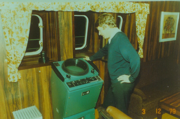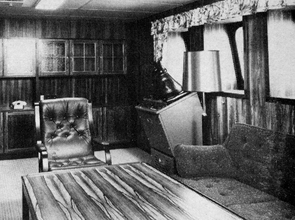 Above & below: Two views of the Zenobia's captain's quarters which juxtaposed rather traditional decor with the practicality of a coneniently-located radar unit. |