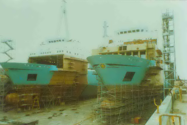 Top: The incomplete Ariadne (later Seafrance Cézanne) and Zenobia together at the yard of their builders, Kockums in Malmö, Sweden. |