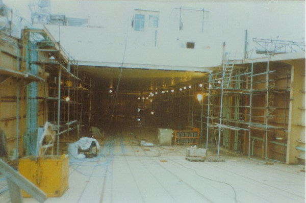 Above & below: The cavernous main freight deck on the Zenobia as it was when the ship was completed in 1979. Designed to carry ISO containers on low-loaders this was rather greater than the height required for the standard freight traffic the Sealink pair would transport after their conversion. Thus, as the picture below on the Alkmini A (ex-Fantasia) demonstrates, the height was reduced by cutting free and then lowering the entire upper vehicle deck, eliminating the unwanted excess height and allowing the construction of the new Deck 3, the main passenger deck, in the space saved. Although the ships became drive-through on both vehicle decks, the internal ramp was retained for the flexibility it offered for potential future use at ports without twin level loading facilities. |