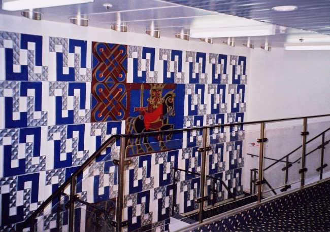 | Above: Another picture of the mural as it was during the Hengist days - this is taken from the A deck forward lobby. Of note are the transparent balustrade panels, which were used throughout the staircases on the three sisters, and remain today. |