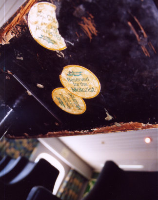 | ABOVE: An unusual 'relic' found aboard the Penelope A on the underside of one of the tables in the port side lounge: Sealink stickers showing 'Reserved for the Motorist' and an early 1980s Sealink logo with 'Folkestone-Boulogne' displayed (as below). The stickers hint at the previous use of the port side lounge: the two parallel spaces were originally designated the motorist's lounge (port side) and the tea bar lounge (starboard side), but this was relatively short-lived with the forward lounge, even before the VSOE refit, becoming the official motorist's area. |