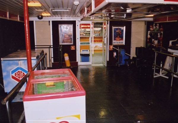 | ABOVE & BELOW: Directly forward of the tea bar (and still in between the side lounges), Hengist and Horsa were built with self-service duty free supermarkets (below). Sealink were never entirely comfortable with this concept in the 1970s and it was stressed that their installation on the two new ships was entirely experimental - sister Senlac was equipped instead with an attractive shopping arcade of four traditional counter service shops. After a couple of seasons, the Hengist and Horsa would be similarly modified (officially due to "loss of bonded goods...together with congestion caused by "eye shopping" only passengers" (Sealink News, September 1975)). This thinking would however last only until the early 1980s when all three ships were re-fitted again with supermarket-style shops. In Greek domestic traffic, shopping facilities are of limited use and in 2004 the area (above) was in use as a games arcade and storage space. |