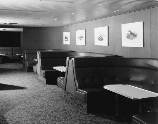| ABOVE & BELOW: The extension of the Wessex Bar in 1986 meant the loss of the intimate Coffee Lounge just aft. This was originally fitted to provide passengers enjoying the service of the waiter service restaurant just aft with a space to retire for coffee having completed their meals. This would then free up space in the relatively small restaurant space for further passengers to be served if necessary. The restaurant itself also disappeared at the same time: with the ships no longer making the slightly longer Folkestone-Oostende crossings, it was felt that the number of passengers demanding full waiter service on the Boulogne crossing was minimal. The inter-relationship between the three areas is seen (below) in this extract from the Hengist's original General Arrangement plan. The picture (above) shows the Coffee Lounge with its similar booth seats to the Mercia Bar, and with a series of wildlife prints on the bulkheads. |