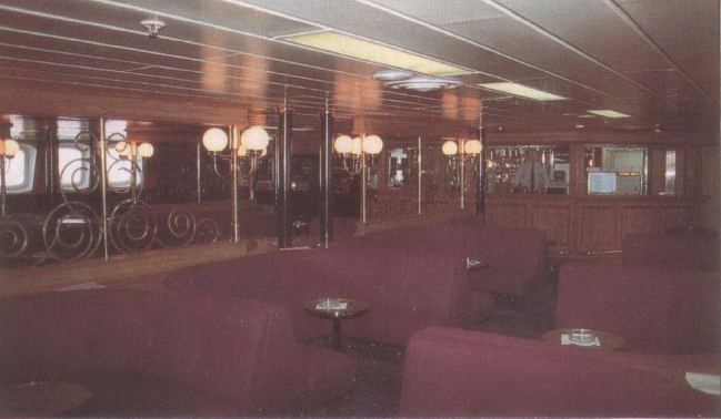 | BELOW: The Mercia Bar as it was after the 1986 refit with the slightly kitsch light fittings which were fitted at this stage and still remain. At the same refit, the small coffee lounge just aft of the bar itself was merged into the larger space, thus creating an increased seating area for drinkers. From the very start of the sisters' careers, a detail differentiation was made with the Horsa's bar being finished in red with the Hengist's Wessex Bar in green. |