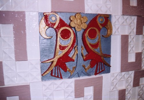 | BELOW: Leaving the forward lounge on B Deck, passengers head up to the upper of the two passenger decks (A Deck) via the main forward staircase off the forward lobby. This features the three-deck high fibreglass mural by the famous Czech sculptor Franta Belsky, essentially identical to that on board the Horsa's sister ships Hengist and Senlac, although featuring a different feature panel specific to the ship. This view from the Penelope A in 2004 is of the stairwell from the boat deck, looking across to port and down to A Deck. The mural is to the left but sadly the feature panel depicting the warlord Horsa himself was replaced by a mirror in the first spell of Agoudimos service. The mural has been repainted largely light pink and cream, but in UK service this was mid-blue with the detail picked out in gold (see below). |