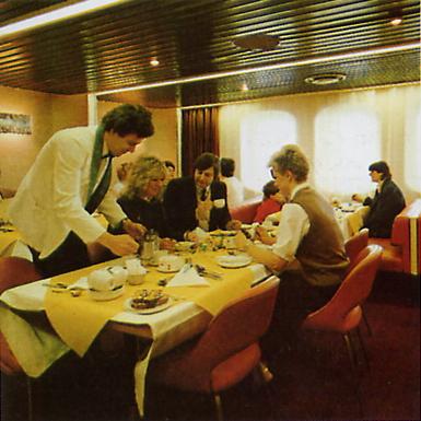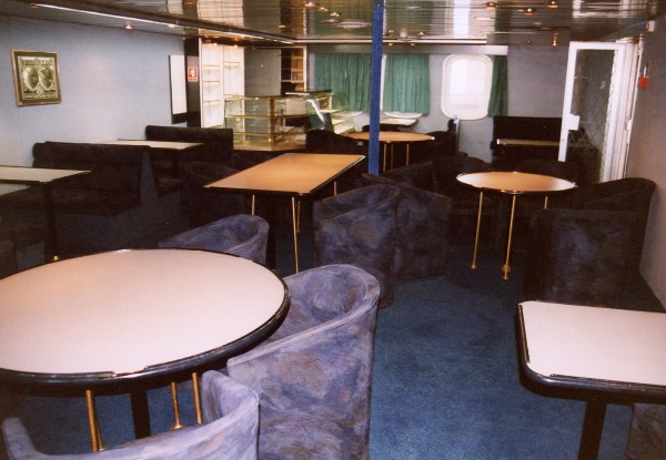 | ABOVE & BELOW: Leaving the former Mercia Bar and heading astern, just across the forward lobby on A Deck on the Penelope A can be found this small snack bar (above - looking across to port with the door from the lobby to the right). Originally the waiter service restaurant (below), tracing the history of the Horsa through the changing use of this space can be quite illuminating, and certainly more productive than attempting to trace any reminders of previous usage in the area at present. As built, the restaurant shared a galley with the cafeteria aft. With only 48 seats, it was a small but pleasant area of the ship with orange seating and more of the large windows that were a feature of the ship. As with the cafeteria, there was no direct sea view, the windows looking out onto the side promenades. For privacy's sake therefore, the thin white curtains were often kept firmly shut - they are just about discernable in the Sealink publicity picture below. Post-privatisation Sealink were not particularly keen on offering waiter-service facilities on short-sea routes, and took the view that the space used by the restaurant could more profitably be used as an additional shopping outlet (the third on board). It consequently became a tax-free shop (as distinct from the B Deck midships Duty Free Supermarket and aft Gift Shop). After moving to Greece, there was no need for these multiple shopping areas, so the Tax Free shop was again converted, this time to a lounge complete with snack bar, fitted out in a blue/purple colour scheme. |