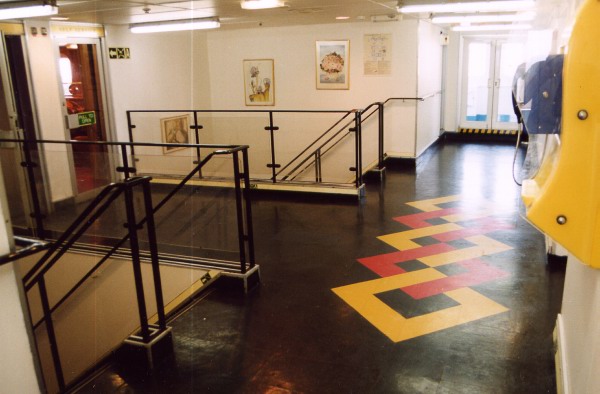 | BELOW: Having successfully navigated their way astern through the side promenades, passengers can re-enter the main accommodation at the aft end of A Deck. Here they emerge into the aft upper lobby, seen looking across to starboard on the Penelope A in 2004. The stairs leading down head to the aft lobby on the deck below, whilst the doorway visible on the left hand side is the entrance to the self service restaurant (see next page). |
