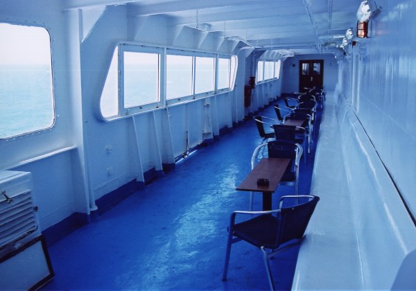 | BELOW: Stretching along either side of A Deck from the forward lobby to the aft passenger deck seating are the long enclosed side promenades. The large openings for these are one of the more obvious external distinguishing feature of this class of ferry and provided a good opportunity to take the sea air for those wishing to avoid the worst the English Channel could throw at the ships. As built, there were few home comforts to be found here - fibreglass seating running along the inside bulkhead being the main divergence from bare painted steel apart from the inboard portholes which faced out from the restaurant areas inside on this deck. Agoudimos Lines identified the potential for better use of these promenades aboard their newly-acquired Penelope A and after a couple of years of Greek service the large distinctive opening were enclosed by glass and converted in part for more productive use. Each was divided half way, with the forward sections now forming part of the Distinguished class accomodation. These areas were carpeted and received more formal tables and chairs in place of the fibreglass benches and were further refitted with new seating at the 2005 refit. The overall effect looks a little unusual, but new roofing panels and lighting mitigate to an extent the messy structural elements visible. The picture below, taken in 2004, is of what is now called the Andros Lounge, on the port side. |