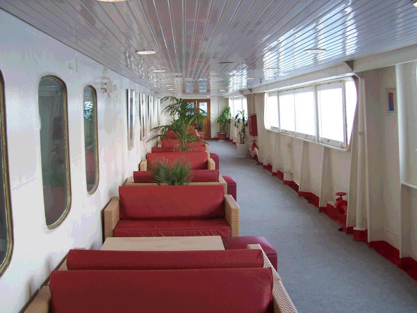 | BELOW: The forward section of the starboard promenade received the same new seating in 2005. The two windows visible on the right are those of the former waiter service restaurant. (Picture courtesy Nikos Thrylos) |
