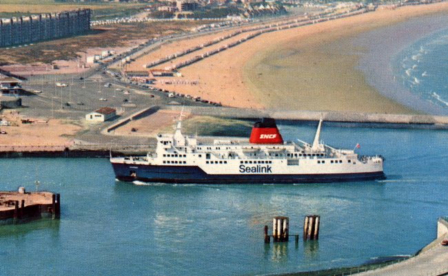 | Above: a view of the Chartres entering Calais harbour in the late 1970s, but of particular interest on this occasion is the area of land just forward of the ship's funnel. This was the location of the original Calais hoverport and the sloping hoverpad structure still exists today. |
