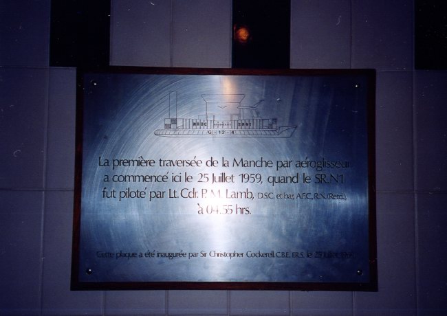 | Above: In the entranceway to the Calais hoverport is this plaque commemorating the first crossing of the Channel by hovercraft on 25 July 1959. |
