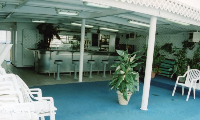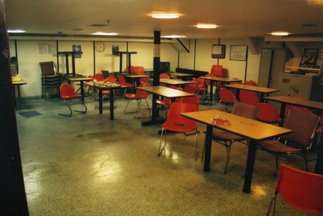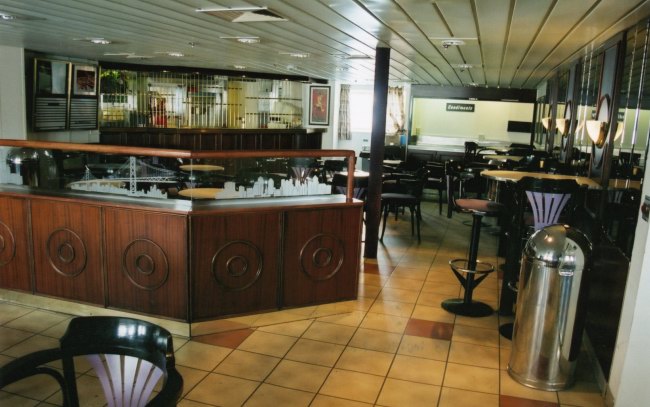 The final passenger saloon, the Manhattan Café, is just aft of the Show Lounge on Deck 7. Modern and rather uninspired, it still featured signs noting that the currency accepted on board was US Dollars. The after end of this deck is given over to more passenger cabins, many of which were added (along with a number on the Bridge Deck above) during a very early Stena refit when the aft superstructure was extended.