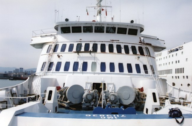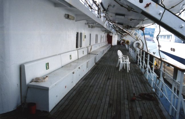 The Scotia Prince’s outside decks are a delight: full-length, teak-planked promenades either side on Deck 7 and similar above on Deck 8 plus tiered platforms astern as well as top deck space forward and aft of the funnel, including a deck bar and hot tubs. When looking around these I suddenly felt a feeling of sadness for her sister the Egnatia III. It was the expansive outside decks which had been one of the most striking features when we sailed on her during that one golden Summer with HML in 2003, perfectly suited to the hordes of deck-class backpackers that the company used to take over to Greece. Whilst the Scotia Prince was in generally very good order, with engine repairs in progress and a new charter to Algeria Ferries due to commence at the start of June, her sister remains in lay up with a very uncertain future. That 2003 season was really HML’s last hurrah, but at the time it seemed eminently possible that their new ship, filled with both tourists and locals, could be the start of a successful new era. Alas it was not to be and now, amidst the financial wreckage of her owners, she is entwined in legal wrangles and looks unlikely to ever sail operationally again.