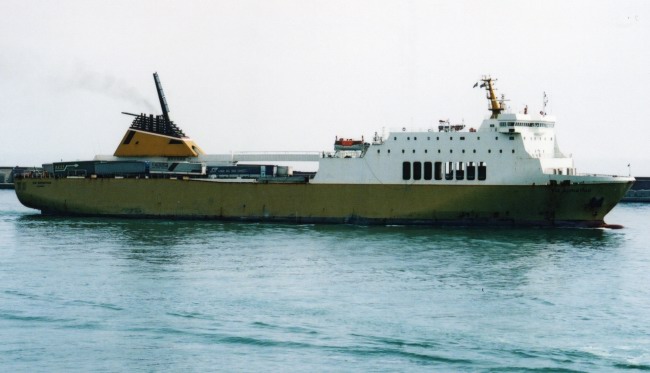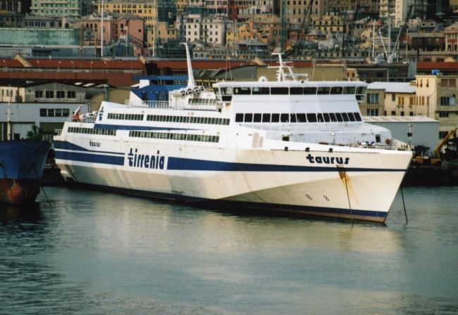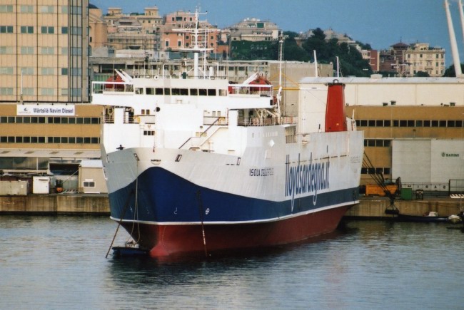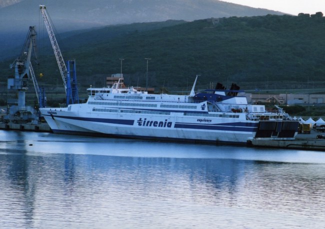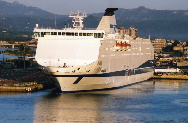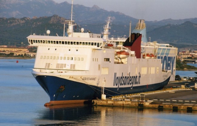 The Janas herself is a well-fitted out ship but curiously uninteresting. She ticks all the right boxes for modern cruise ferry design, with contemporary décor and furnishing but without any of the wow factor that the best of the type have. This is perhaps as Tirrenia would want it – efficient passenger transport without some of the fripperies of cruise ship pretension that Minoan, Superfast or, more relevantly, GNV offer. To me however the ship and her crew seemed respectively uninspired and unenthused and one felt that a little bit more could be achieved with not much effort. Arrival at Olbia the next morning was on schedule at 7.15. Already in port were the Moby Aki, Lloyd Sardegna’s Golfo Aranci and our ship’s half-sister Nuraghes: the latter presented a rather more massive appearance with her extra deck compared to our ship and berthing next her this was underlined as her equivalent passenger decks were several metres higher, although admittedly she had fully unloaded by this stage. Another of Tirrenia’s apparently unsuccessful fast ferries, the Capricorn, was laid up on the far side of the harbour: these ships seem to lie scattered across various ports of Italy’s West coast, never two in the same place but all out of use. [continued below] |