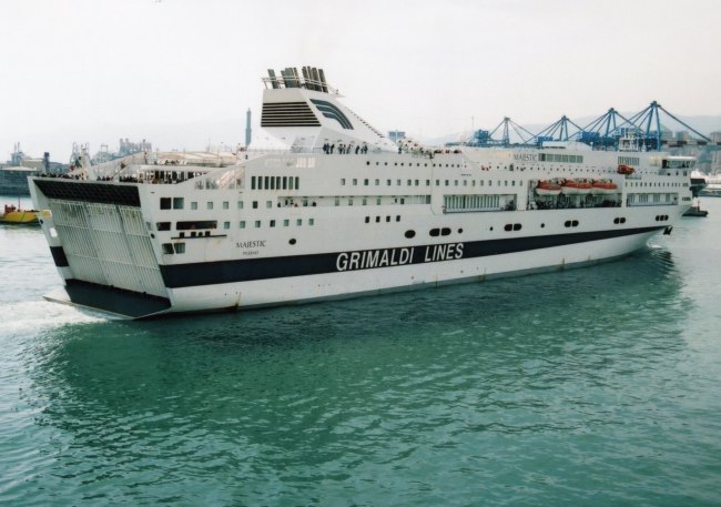 | Leaving Genoa for the shipping enthusiast is always an experience, particularly as you pass the shipyards to the east. All the ships previously mentioned were sailed past at close quarters and it was difficult at times to know which direction to look such was the array of impressive passenger shipping on display. A pleasant and unanticipated sight earlier had been the arrival of the Adriatica freighter Via Adriatico which links Genoa with Sicily. Unlike a couple of her sisters still in the Tirrenia Group’s combined fleets, she actually has the full Adriatica colours although alas not the winged lion on her funnel. Other arrivals during the afternoon had been Grimaldi’s Majestic and GNV's La Superba so the ferry terminal was also well stocked with ships come our departure time.