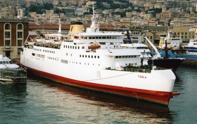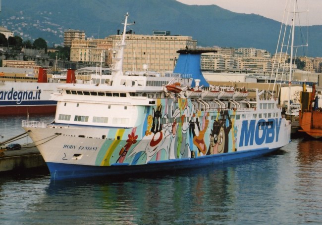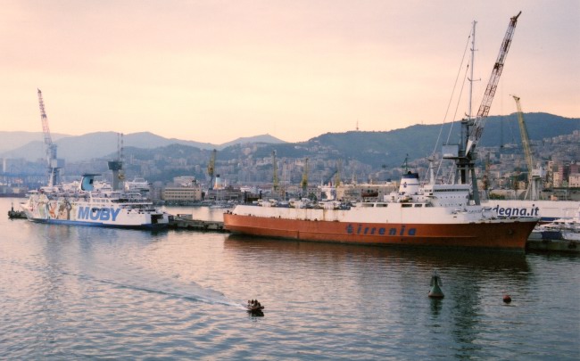 | Top: The Moby Fantasy and Calabria in the shipyards at Genoa, seen from the departing Janas. |