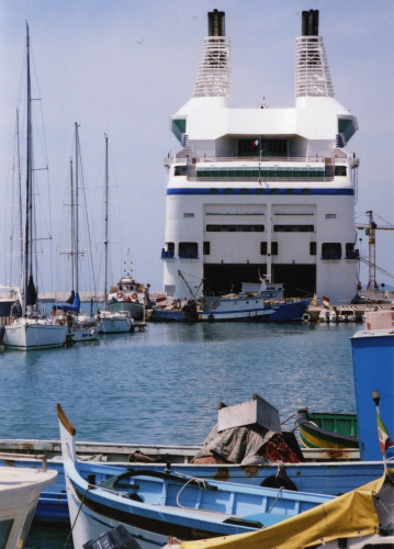 I replied “No” “If you say ‘no’, and we find them, you know you will be in big trouble” “I don’t have any”. “But if you admit now, hand them over, there will be no problem” “Ah” I suddenly found myself thinking that perhaps it would be safest to admit to possession now just in case some had inadvertently found its way into my bag. But I held my nerve. Slowly he unpacked the rucksack item by item, although it wasn’t much of a thorough search: I have come to the opinion after several of these searches from the Moroccan, Spanish and Italian police that if I was interested in drug smuggling, the best place to hide them would be in film cartridges as, despite the unusual volume of these I usually have with me, they are neither questioned nor competently searched beyond a quick shake. The dogs’ enthusiasm unanswered, the officer carefully repacked my bag and let me on my way. By this time however, we had missed the connecting buses to Palau and, with a broadly blank face at the terminal’s information desk when enquiring about onward buses from there which would arrive at Porto Torres in time for our late afternoon departure, we decided to give our planned couple of return sailings over to La Maddalena a miss and play it safe (and leisurely) by heading direct to Porto Torres. After a train and then bus journey (interrupted by a stopover in Sassari) we stepped off our bus in Porto Torres and right before us was the sight of the Napoleon Bonaparte reversing onto her berth, some distance away from the other ferries at the main passenger terminal on the other side of the harbour (one could make out GNV and Tirrenia funnels but not much else). After photographing her towering over the neighbouring fishing boats we headed to a restaurant for an early lunch on its terrace with a view of the NB in the distance. Fully replenished, it was time to head towards our ship. SNCM’s base in Porto Torres is not signposted at all other than the huge presence of their ships which, although obviously a clear indication in itself, does not remove the slight doubt as to whether you should present yourself first to the main ferry terminal. This is not the case however and SNCM have their very own little terminal in the guise of a ramshackle concrete building which gives all the impressions of having once been a public toilet block. Wandering in here to try to check in and ascertain boarding times I was screeched at and shooed out by a female staff member who slammed the door shut and, from inside, flicked a switch which brought some metal shutters crashing down for an additional layer of protection from enquiring passengers. This seemed slightly peculiar, but admittedly there were a couple of hours until departure time. It did however give some time for a thorough investigation of the little terminal. Round the back there was another door (or more precisely, an opening for a missing door), which revealed a room curiously filled almost to its roof with refuse. From here the screeching lady could be heard involved in an intense argument with another member of staff. Happily, after another half hour of waiting, the shutters came back up and we were able to check in, with boarding following soon after via the car deck. After some previous encounters with SNCM where carefully laid-plans have been undone by strike action, this was already an excellent start. [continued...] |