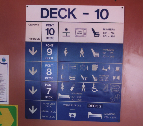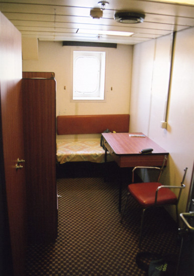 Evidently loo rolls were not the only thing past passengers had been interested in pinching. Our cabin presumably had once been properly fitted out, but now it was rather bedraggled – someone had at some stage on a previous crossing evidently attempted to kick the door in and comparing to other cabins which could be viewed on the same deck, none of which had a full complement of fittings, we were missing the curtains from the window (although the curtain rail remained), curtains around the bunks, the arm-rests and back to the chair, one of the lifevests, and the ladder to access the upper bunk. Fortunately the two berths and the sink in the corner were there, and that was all that really mattered. On the underside of the upper bunk was a farewell inscription from the cabin’s final P&O occupant: “Paula Mason Turd [sic] Officer 24/9/02”. |