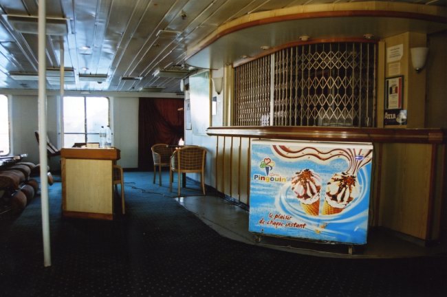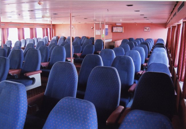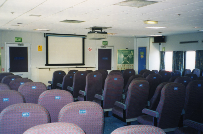 | Above: The after of the Deck 10 lounges was permanently locked on the Oujda but was visibly unchanged from its time as the cinema on the Pride of Hampshire, as pictured. |