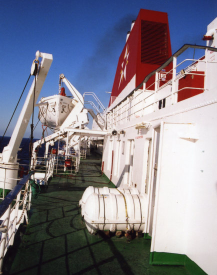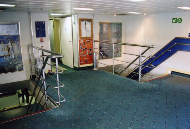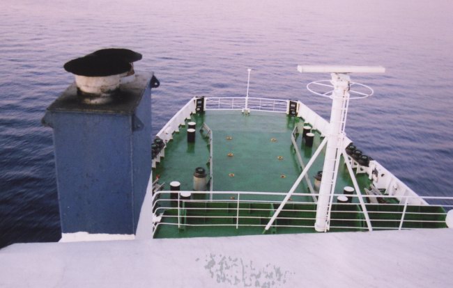 Rather unexpectedly, my main course on that first night was served on a Color Line ‘Captain Kid’ plate – quite how this ever ended up on this particular ship was and still is a total mystery. Conversation around the table meanwhile turned to the ship herself, and the regular passengers were unimpressed. On the other hand, everyone raved about COMANAV’s flagship the Marrakech – the dance instructor noting that “she is beautiful, much nicer than this old thing. More like the Titanic – très beau!” with a flick of his fingers to his lips to amplify the impression. During dinner, the weather turned and the ship began to experience some quite distinct slamming. This was quite a unique form of the affliction as, rather than at the bow, it affected most severely the aft half of the ship. When the Viking Venturer was rebuilt in 1986, she was fitted with a completely new hull bow section, running from amidships forwards. The aft part of the original hull was then attached to this, the new upper vehicle deck built above and then the original superstructure put back on top. This surgery has left the ship with all sorts of lumps and bumps in the hull and evidently the waves were catching on these, producing the violent slamming experienced in the restaurant. The staff and regular passengers carried on unperturbed, but it was somewhat disturbing for the rest of us; the next day, one of our dinner companions darkly confided that the previous evening she had felt compelled to pray for our safe arrival! [report continued on next page] |