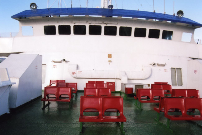 | We left Sète promptly at 1900. By all accounts, price increases by budget airlines allied to the special offers from COMANAV’s French agents Euromer had boosted passenger numbers on this sailing and, although we were advised that there were about 300 on board, it felt like rather more although certainly not challenging the 1,600 passenger limit which the ship apparently is certified to carry. The majority of travellers were Moroccan but there was a fair smattering of French. Quite what the experience would be like with many more passengers is open to question. Certainly the ship, which had been in only modest order when we boarded fairly speedily declined into a rather abject state after departure. Having thought about this in advance, and given our cabin was not en-suite, the first thing we had done once on board was to have a shower in the public block down the corridor. This proved to be an astute move – the conditions were fairly squalid as it was but a visit later that evening revealed that things were rather worse – the showers were now all thoroughly filthy whilst finding a clean and functioning toilet seemed a near impossibility. The thought arose that perhaps the ladies toilets would be in a rather better state but that was soon dismissed – if anything, the proportion of these filled to overflowing with who knows what was even worse. One regret was our failure to bring our own toilet paper with us on board – clearly one of the first things that COMANAV passengers do is to strip all the public lavatories of this valuable commodity and it was by some luck that I came across an unattended roll by the sink in one of the cleaner toilet blocks. Fully expecting its forgetful owner to emerge from one of the cubicles, I stuffed it under my t-shirt and ran away from the scene of the crime hoping that no-one had seen me make off with my priceless loot.