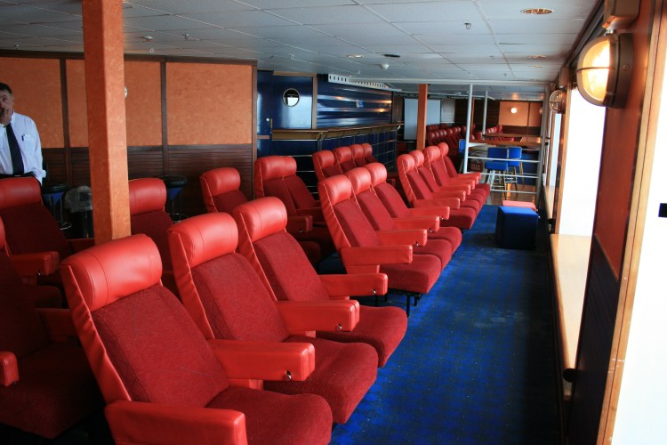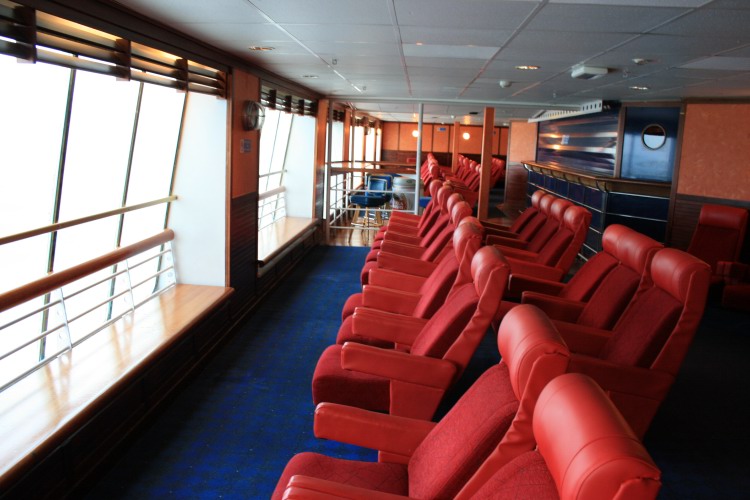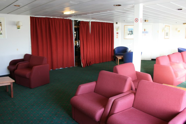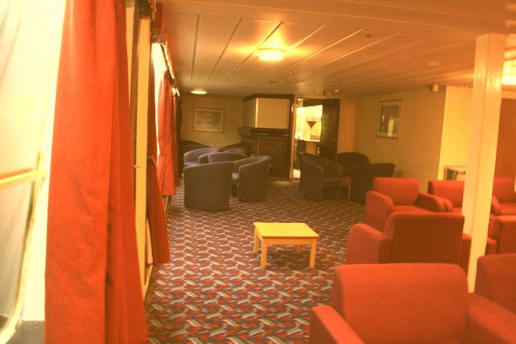 | Above and below: Starting our tour of the main passenger spaces, the aft lounges on Deck 7 (astern of the show lounge) are on both ships now quiet areas - the Stena Europe (above) has seen the former Disco Bar fitted with aft-facing recling seats; the bar counter remains in place but permanantly closed. On the Normandy (below) the same space had become the First Class bar in the Harwich-Hook days and then initially saw Irish Ferries service as 'Molly's Dublin Bar' but was fairly soon split into two with the port side section (pictured) becoming the 'Beckett Reading Room'. |