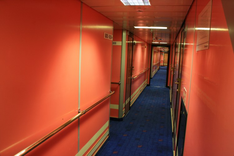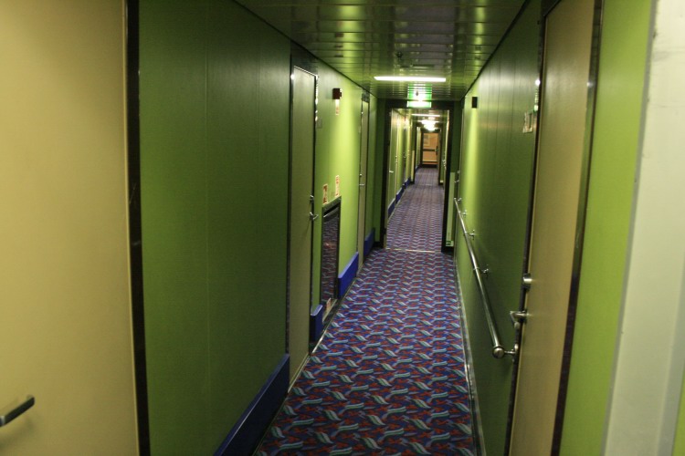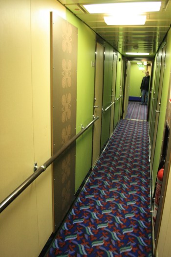 | Above and below: The forward cabin areas on Decks 7 and 8 are virtually unchanged from original on both ships today: the Stena Europe features pink wall panelling (above) in areas where the Normandy (below) has green. This almost mirrored the colour schemes of the ship's showlounges, which were respectively red and green. |