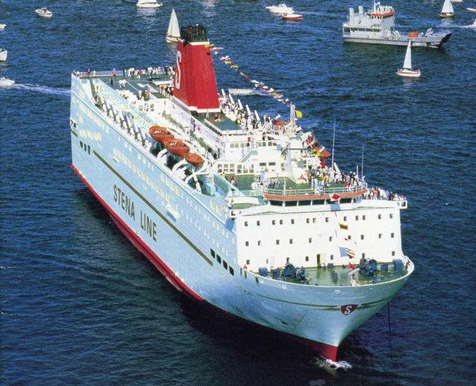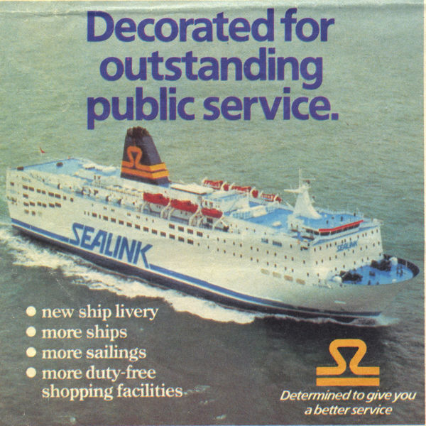 | Above: The second of the sisters (originally Prinsessan Birgitta) lay unwanted and incomplete for a period after the takeover before a brief 1982 season on the Gothenburg-Frederikshavn route. In 1983 she was sent on charter to Sealink UK as the St Nicholas, becoming their flagship on the Harwich-Hook of Holland run. In March 1984 she was present at Dover to launch the company's new livery and featured prominently in company publicity of the period. |